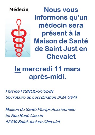 Dès le mois de novembre, des médecins volontaires assureront des consultations ponctuelles à la Maison de Santé Pluridisciplinaire, 55 rue René Cassin à Saint-Just-en-Chevalet, grâce au dispositif national de solidarité territoriale « Un médecin près de chez vous ».